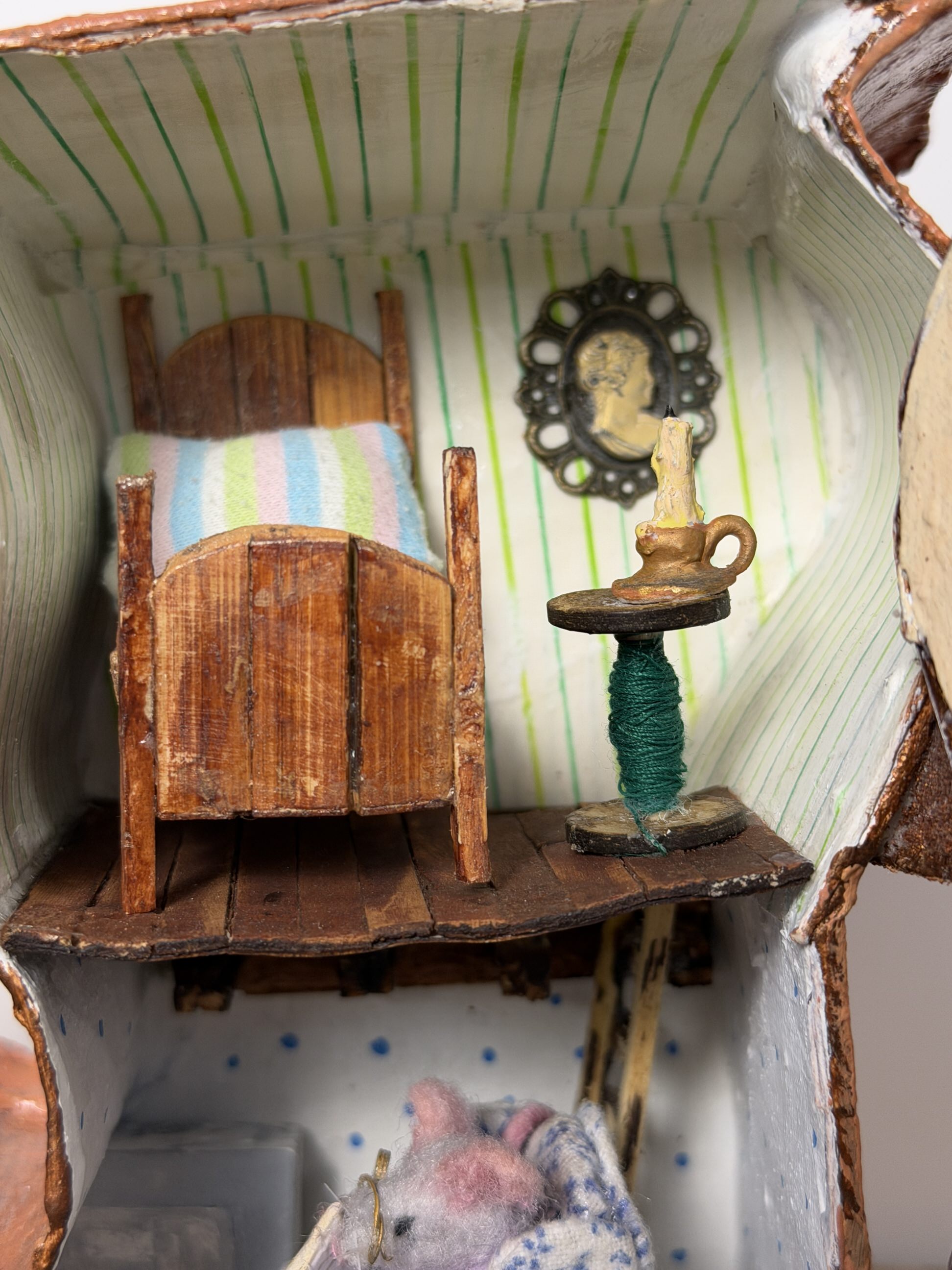 The boot structure was molded from cardboard. Inside, the walls were made from hand-painted paper. The living room floor is made from paper clay, and the bedroom floor from coffee stirrers, as is the bed.