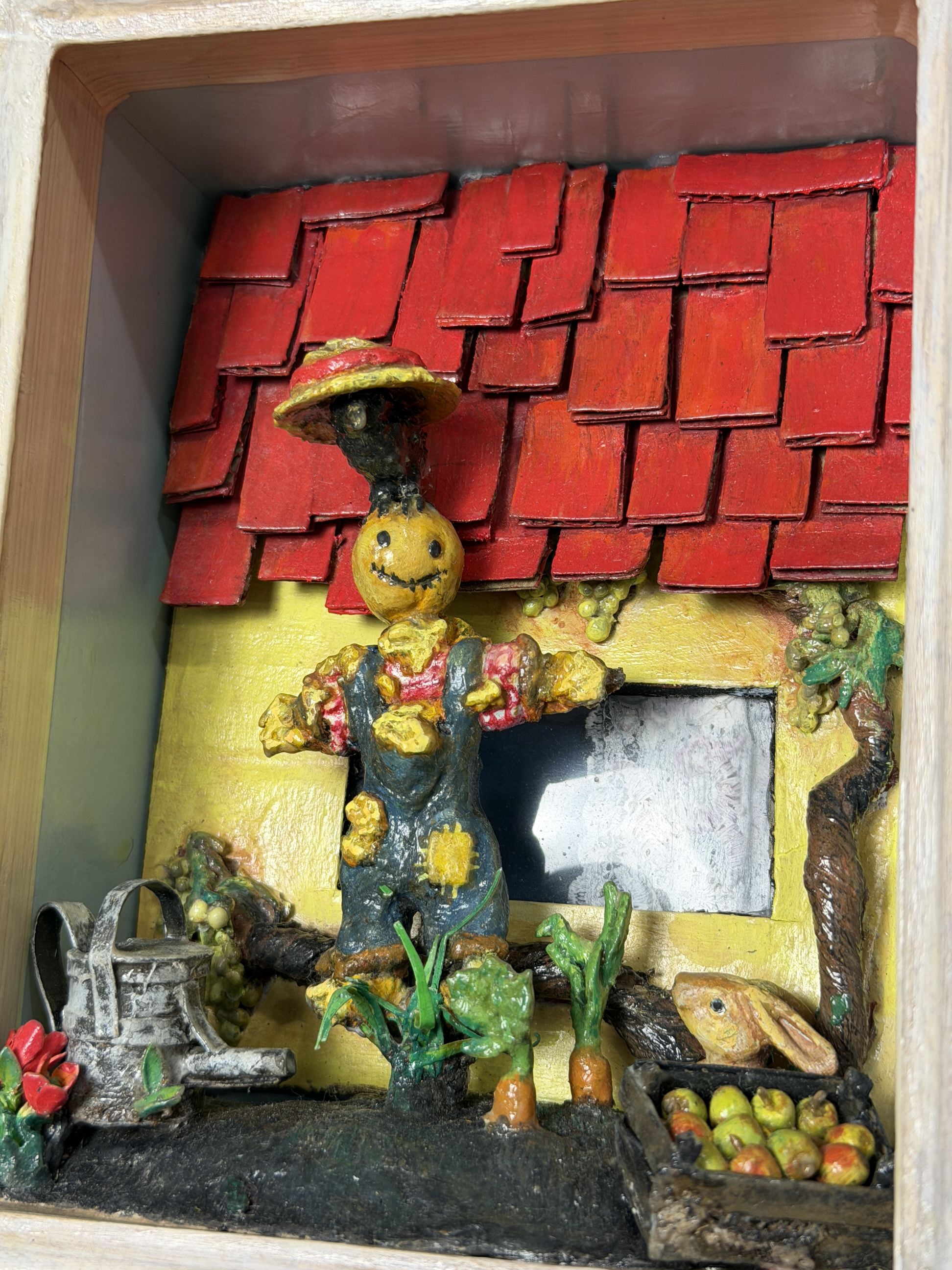 The crow on top of the scarecrow already shows that it doesn’t scare the birds properly, nor the little rabbit coming out of the ground to eat the carrots.