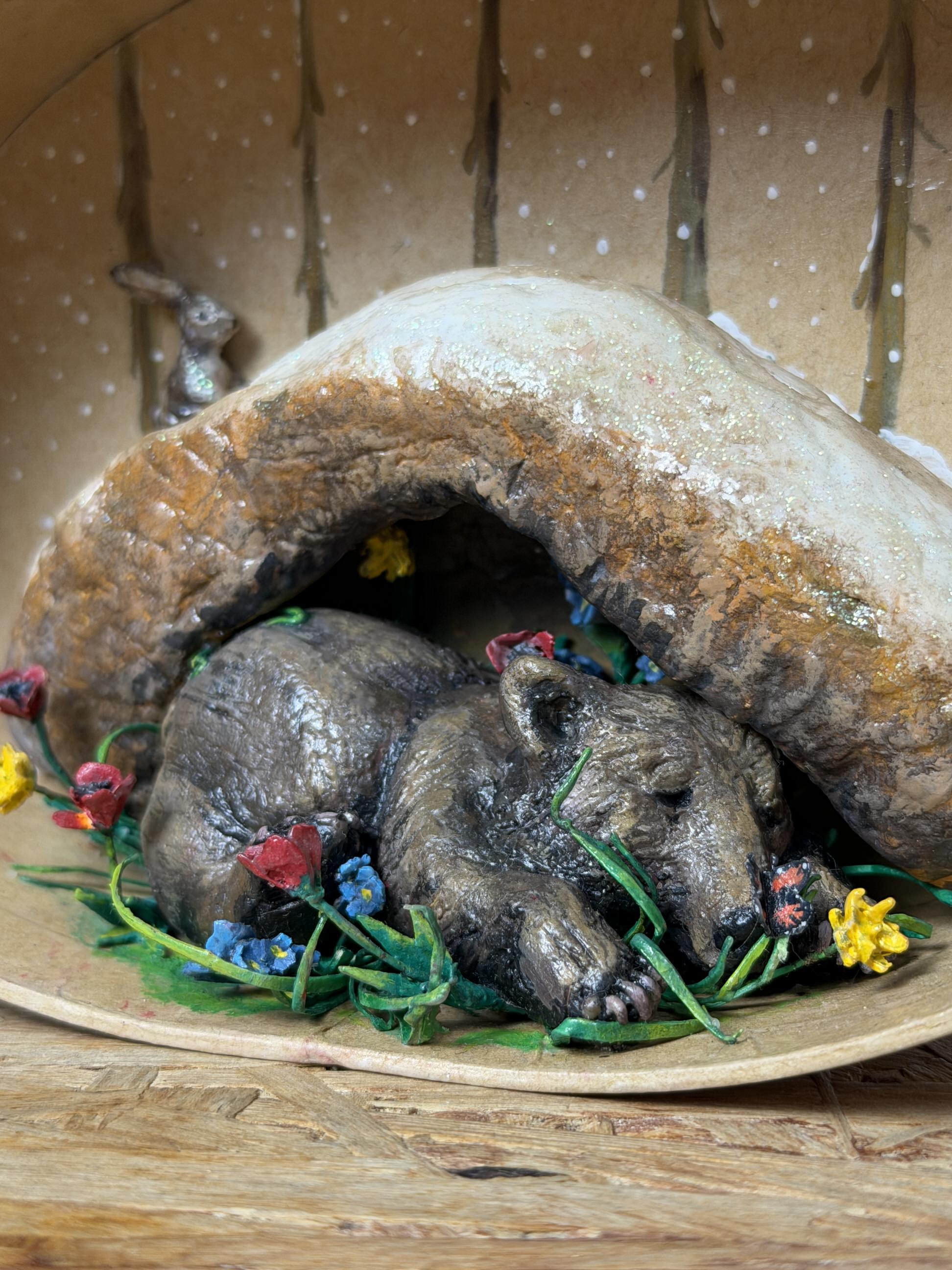 The bear is in a cave, hibernating, while a little rabbit is being hit by the winter cold. Never stop dreaming during the harsh winters of life.