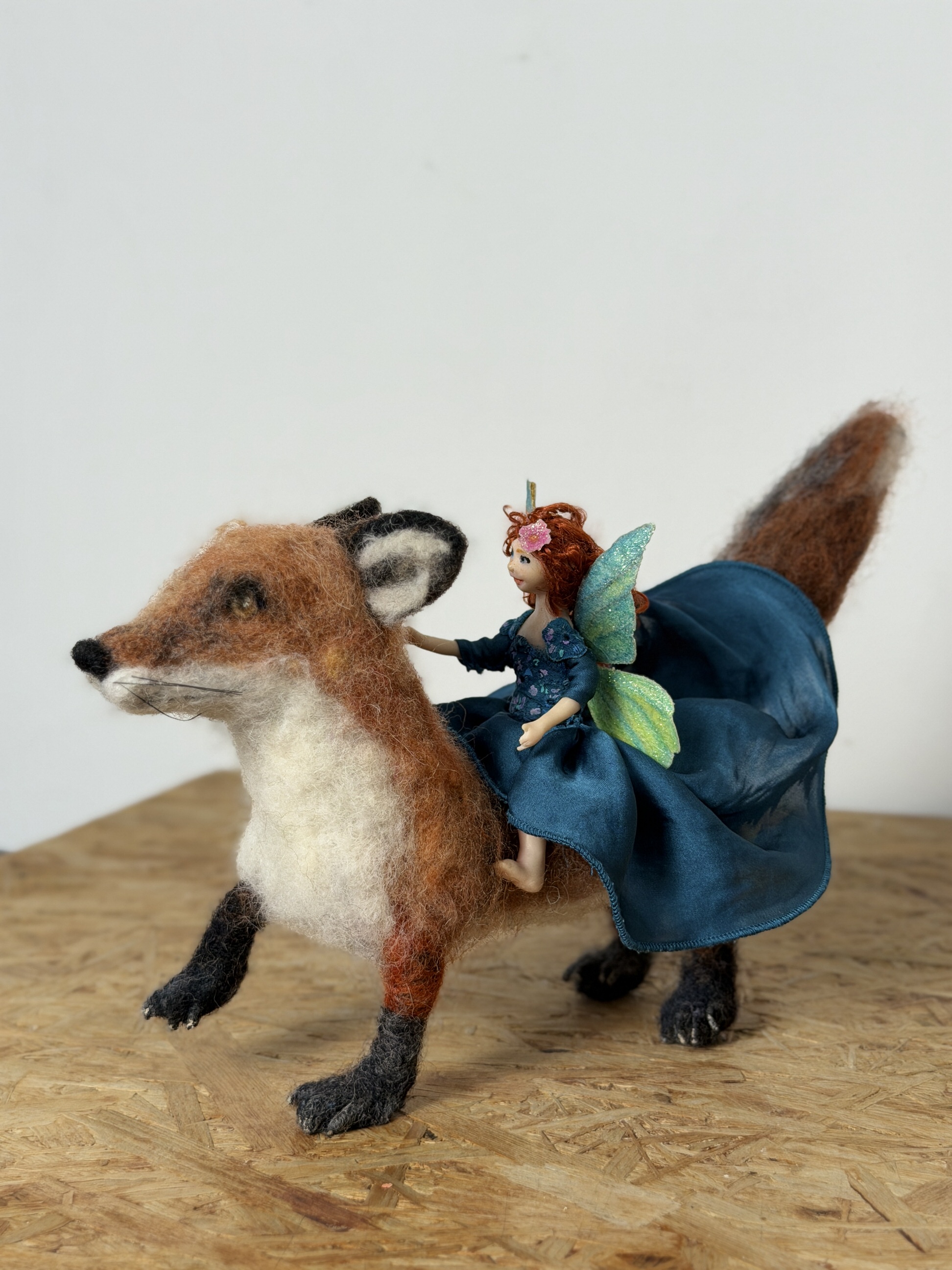 This fairy was designed to sit on the back of the fox I made using felting. There is nothing like closing your eyes and imagining the fairy on top of the fox, whispering that autumn has arrived and that she must shelter with her cubs—like an angel guiding what we should do for the good.