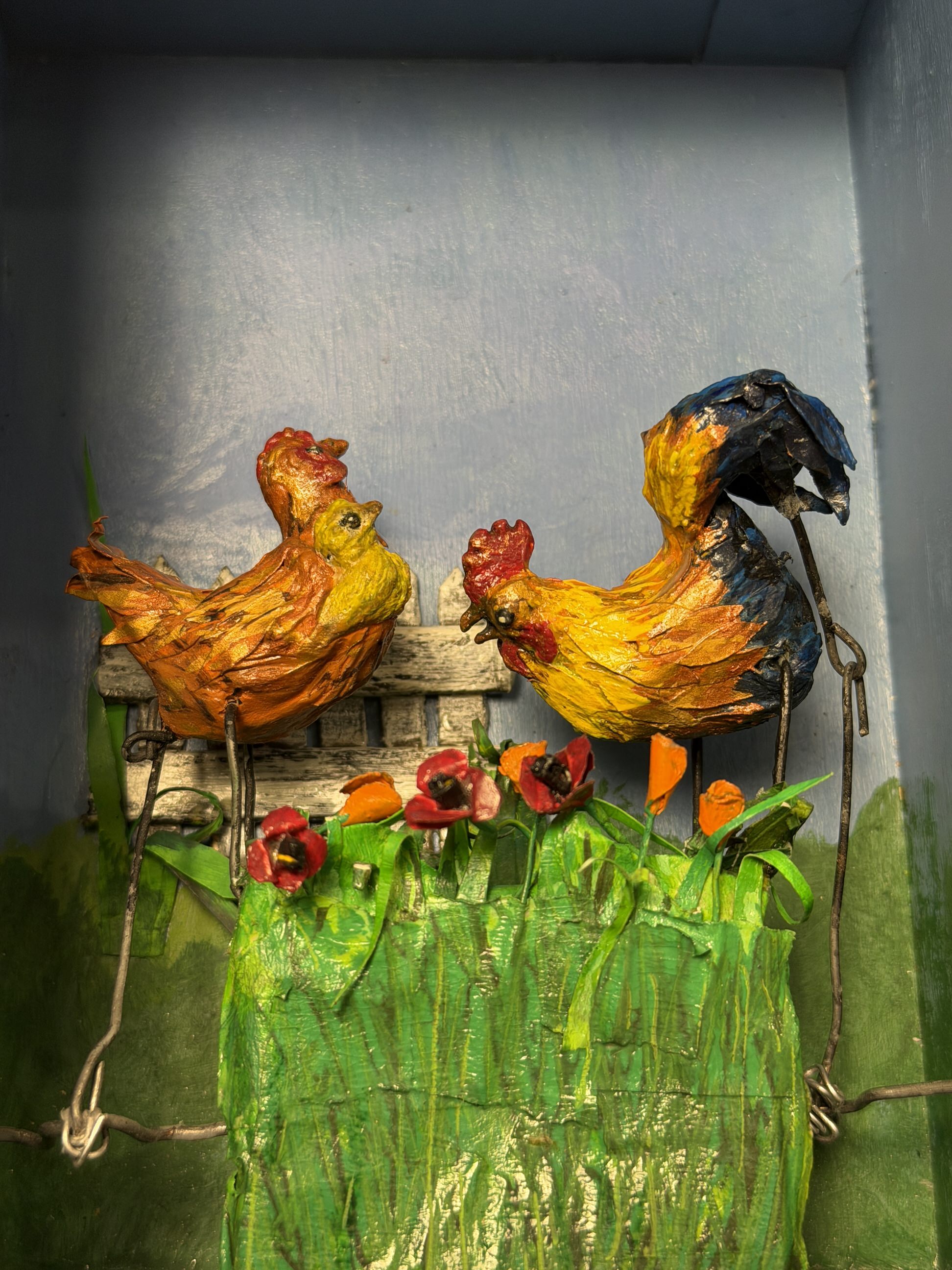 In everyday life, Nature creates simple scenes that enchant me: a hen with her chick protected under her wing, scratching the ground, a rooster eating peacefully beside them.In this piece, the up-and-down mechanism brings the scene to life, showing the animals eating, almost hidden in the grass and among flowers made of paper and hand-painted.Unique piece carefully made by Dina Cró.