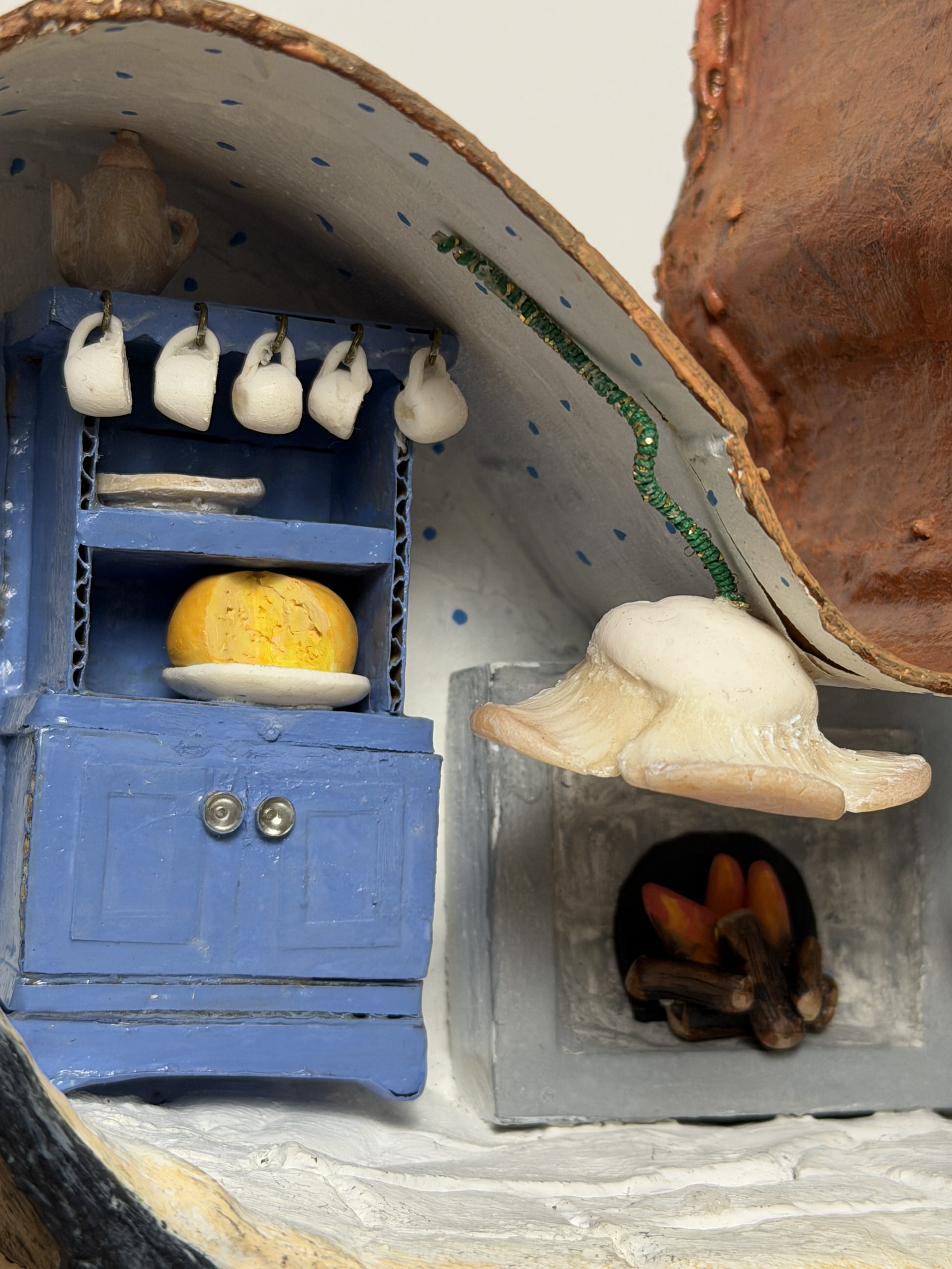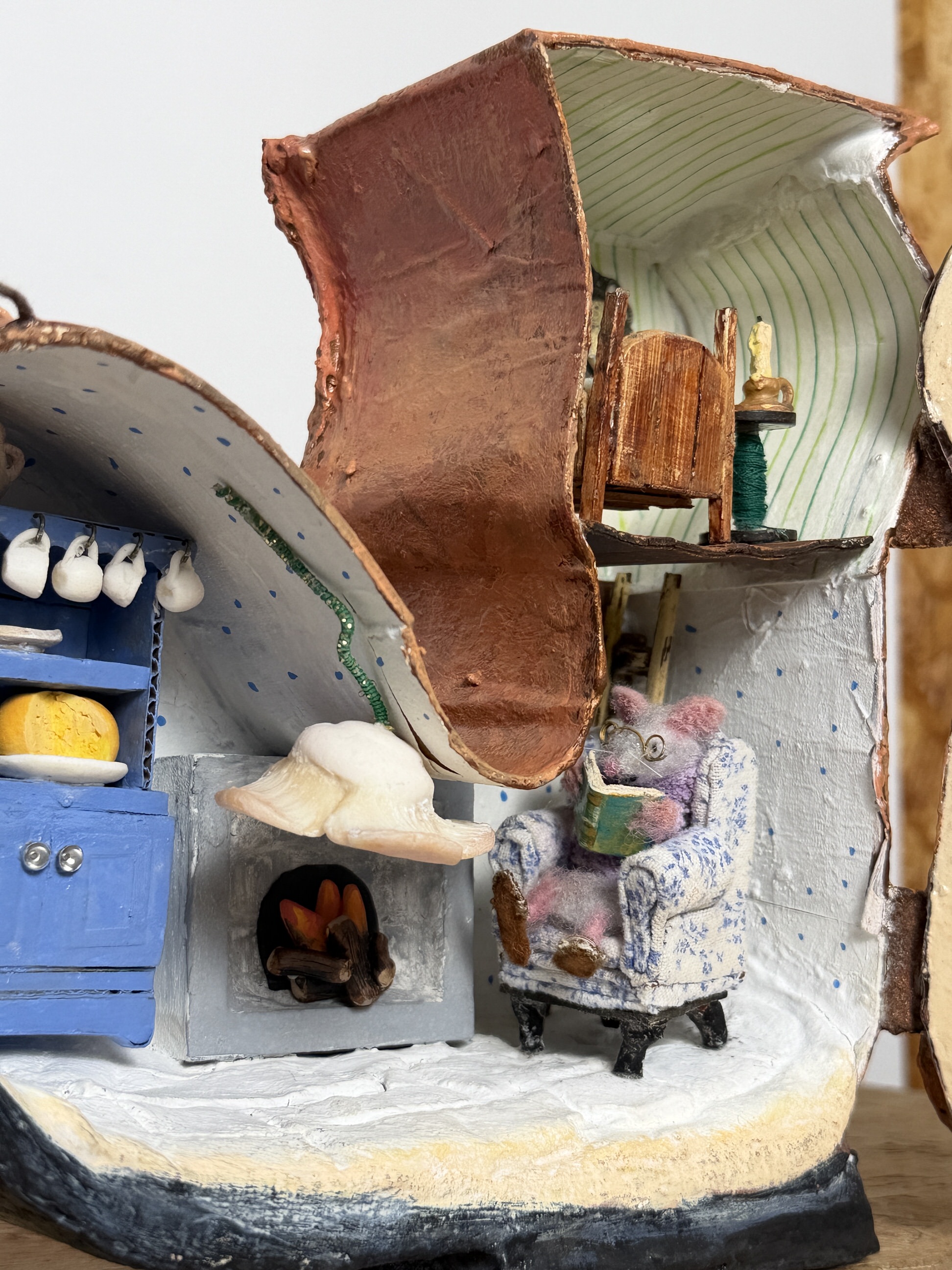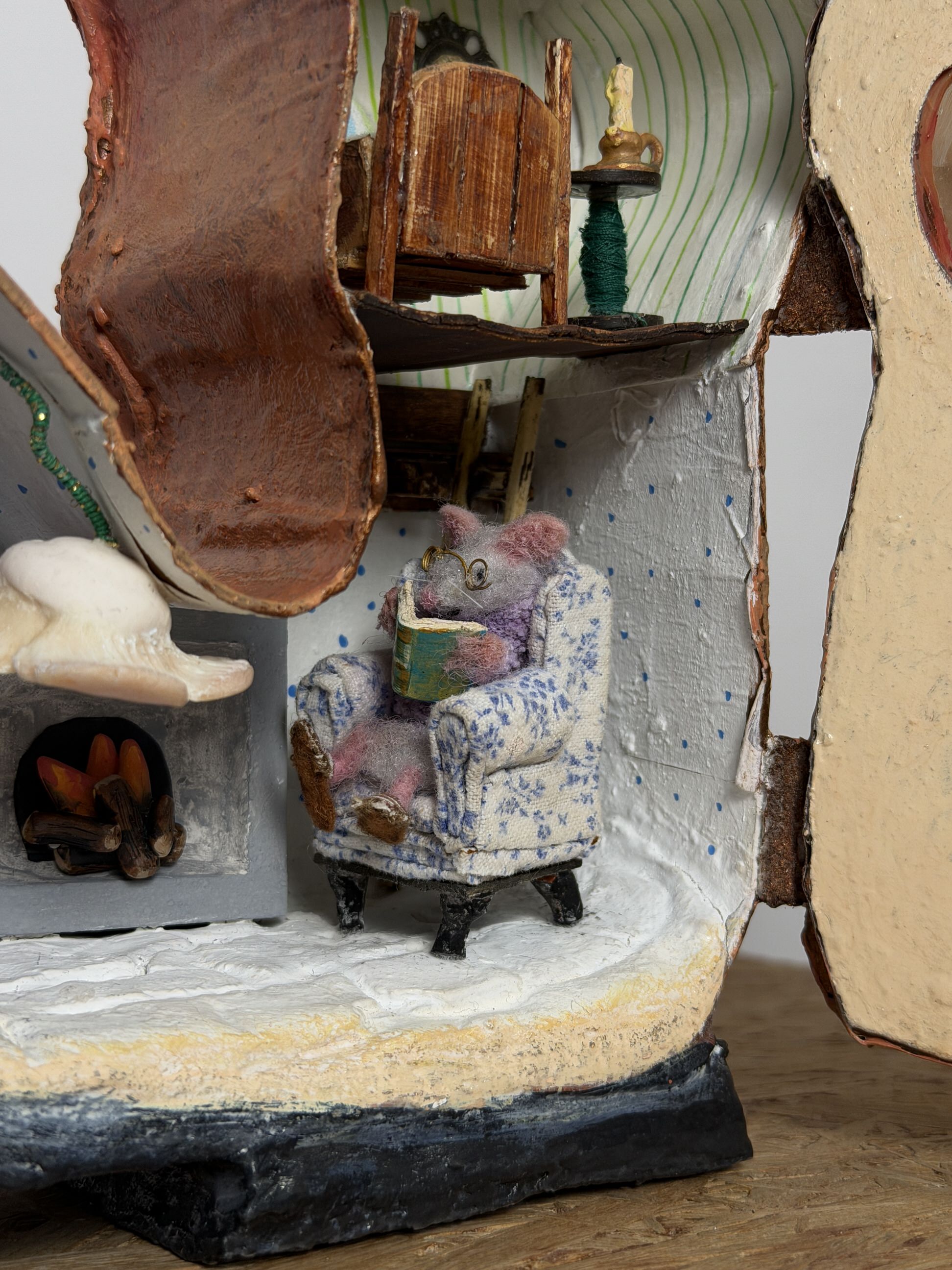 The remaining details of the house were constructed with fabric, wool, wire, plastic ceramic, cardboard, and wood—everything sculpted and painted by hand.