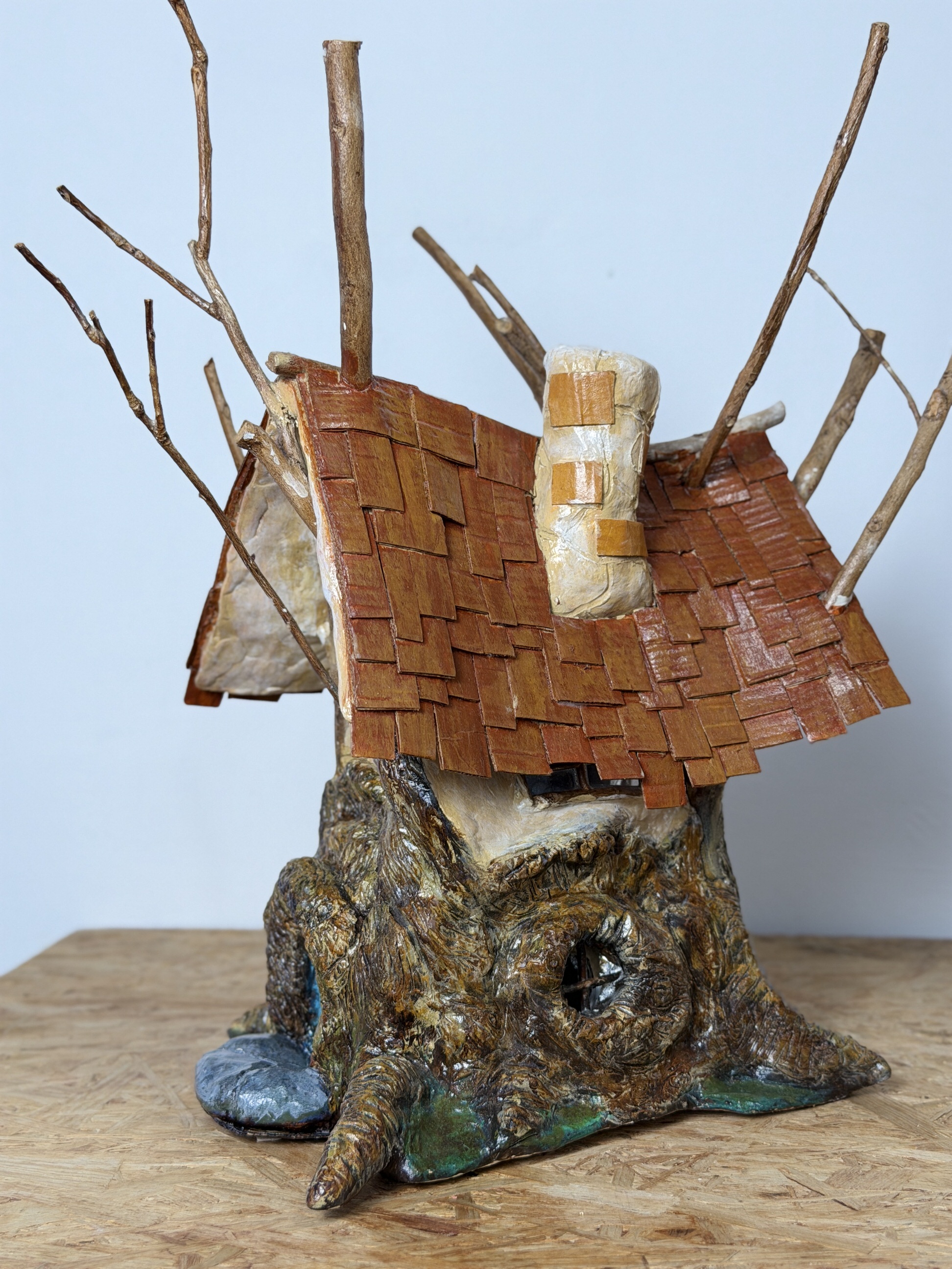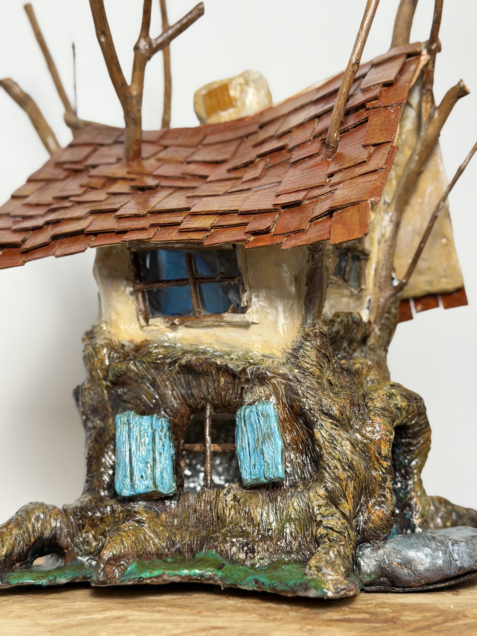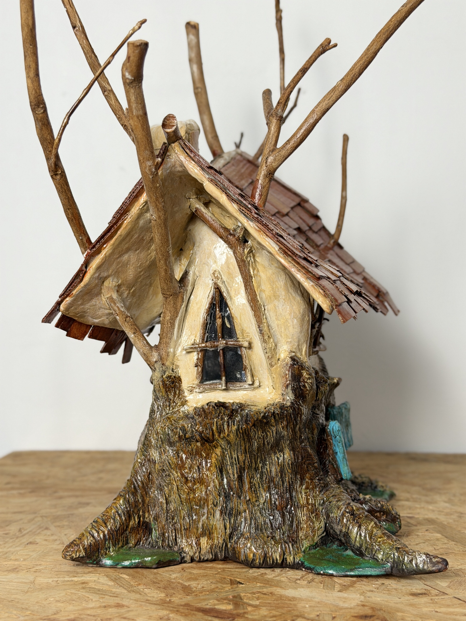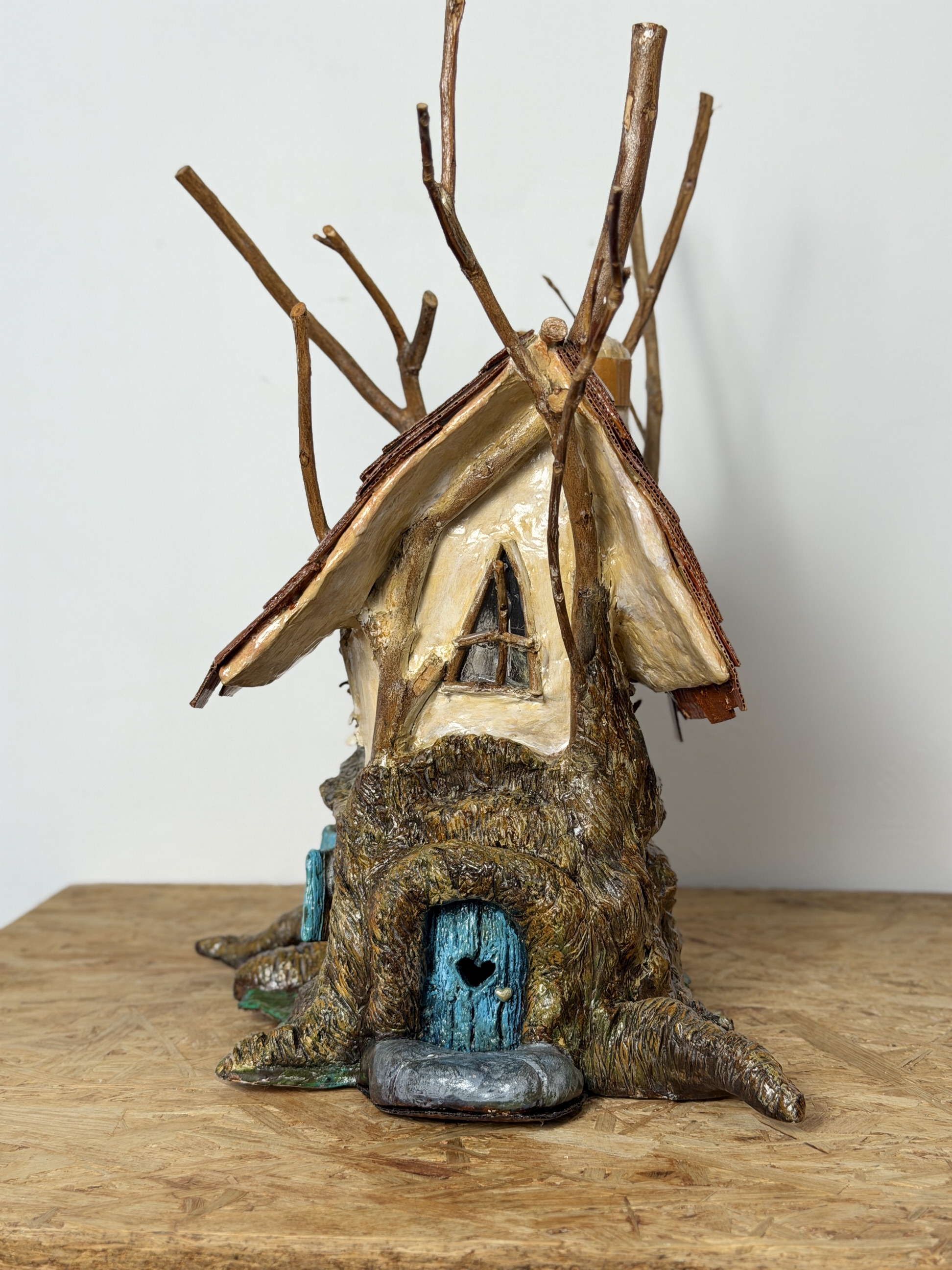 I have always wanted to have a treehouse, and this is how I made my dream come true. I gathered natural branches, a lot of cardboard, a plastic bottle for the inside, and began shaping a house. I placed branches in the windows, cardboard cutouts on the roof, and spent many hours sculpting and then painting my vision. The branches were reinforced with several layers of white glue.