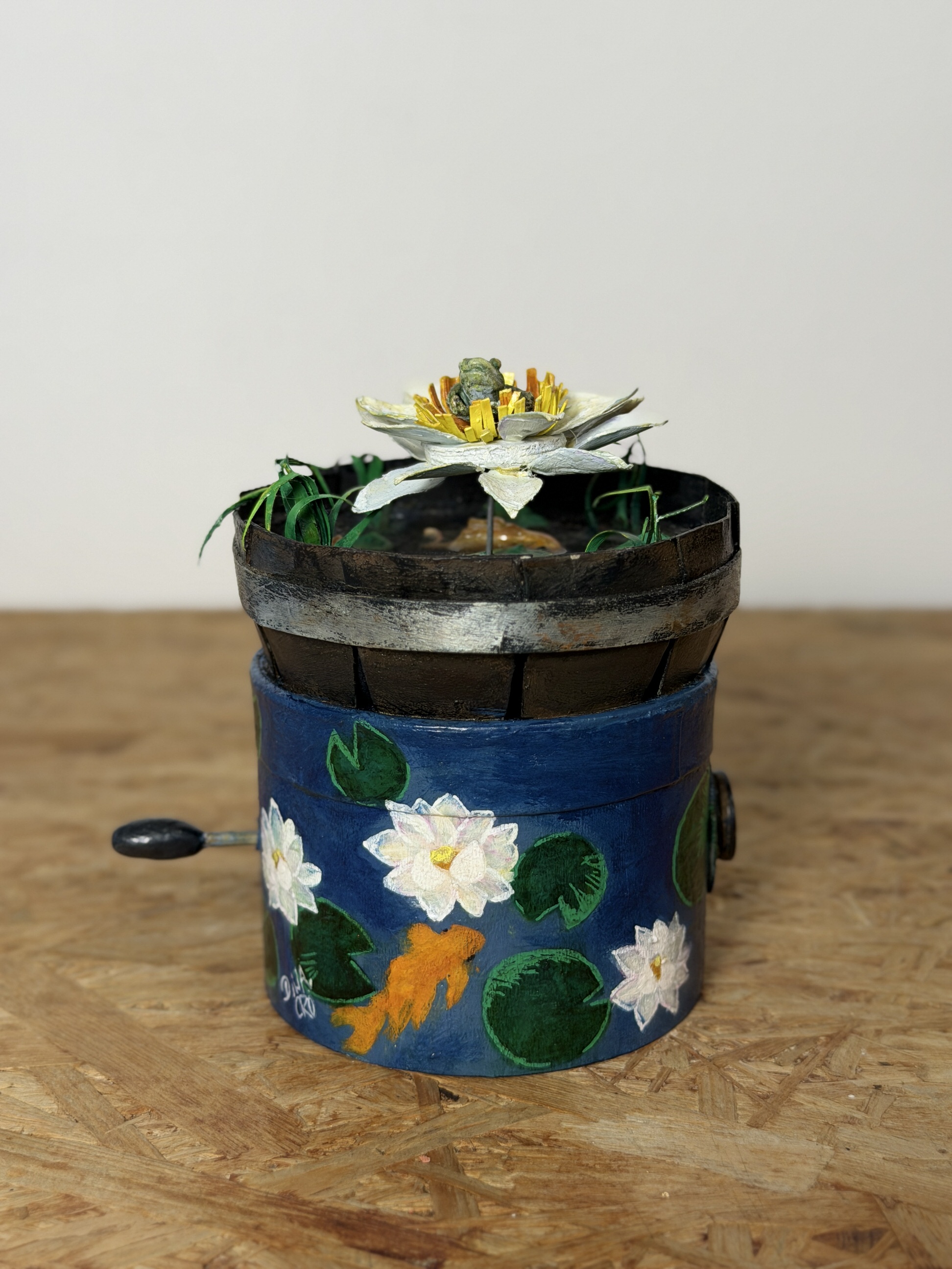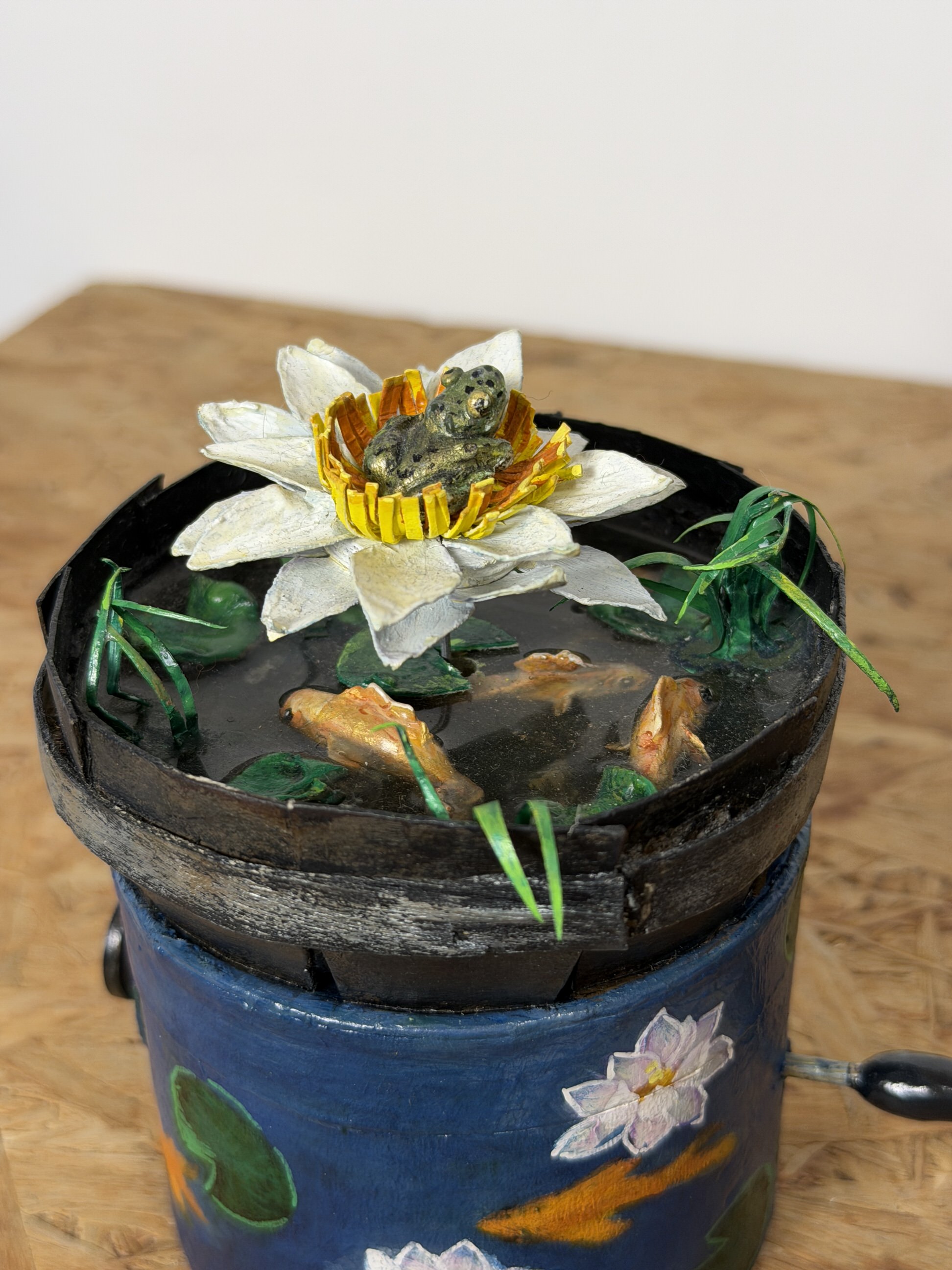 Na base do mecanismo pintei pequenas flores aquáticas brancas e peixes.