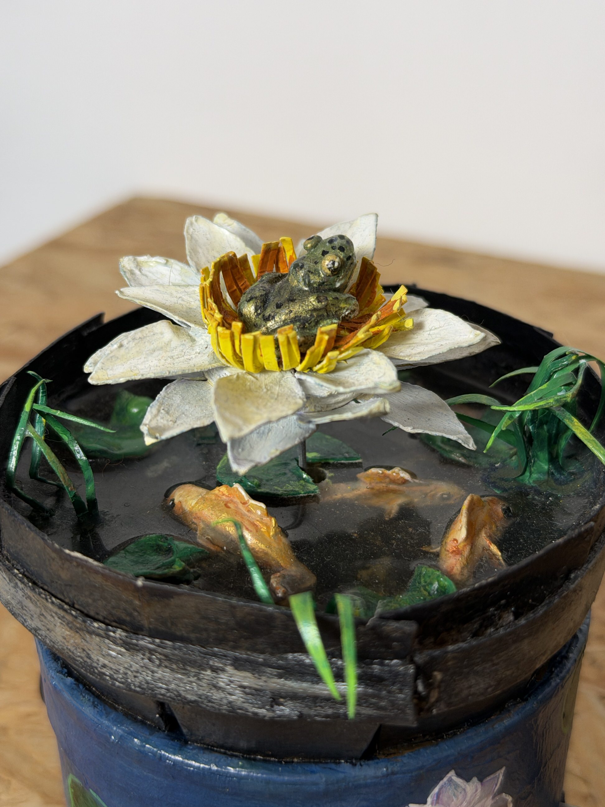 A flor principal foi feita em papel e pintada à mão, e o sapo em cerâmica plástica.