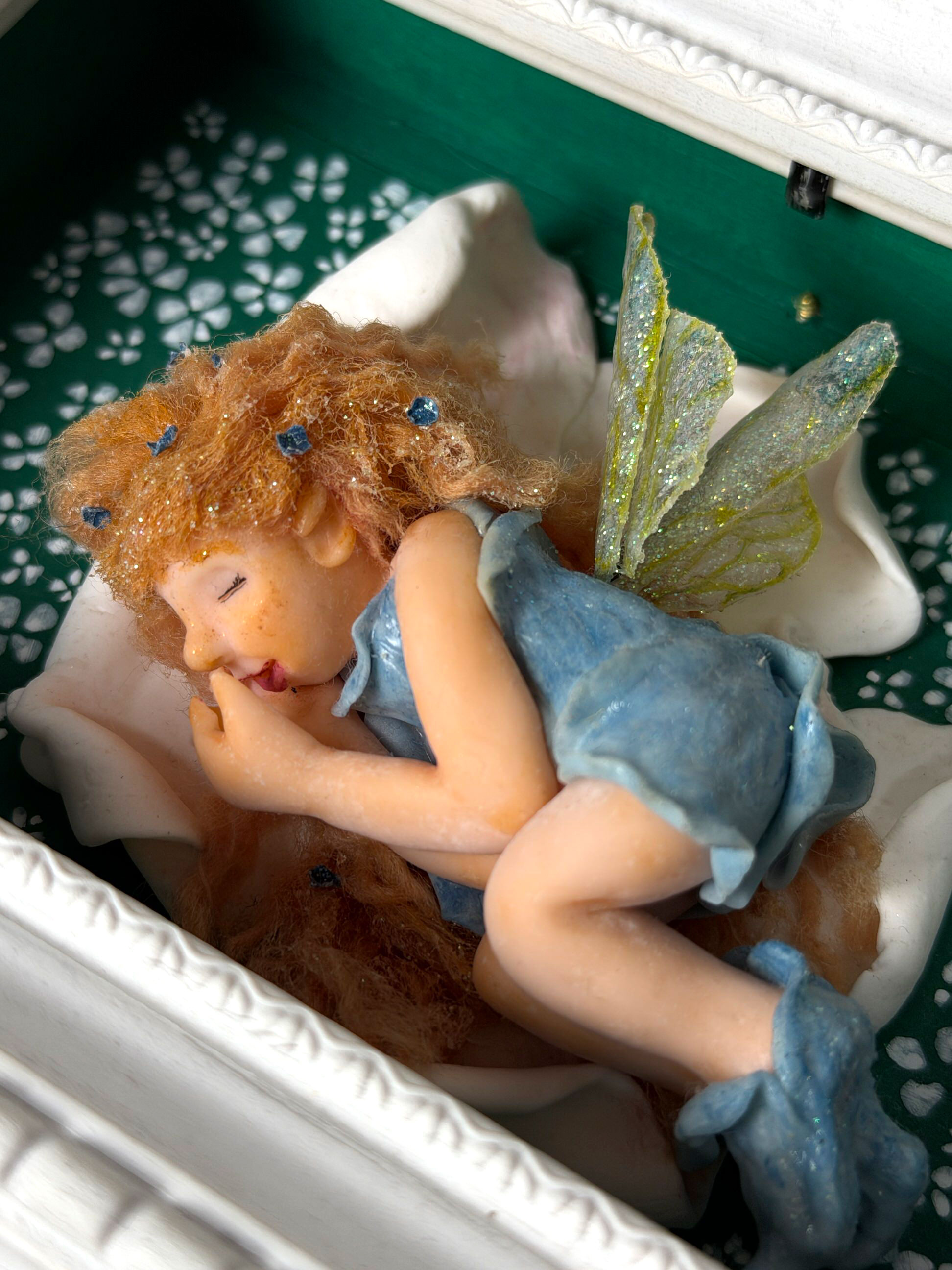 Fada feita em cerâmica plástica. Cabelo da fada feito com novelo de lã e flores bem pequenas em papel, asas da fada feitas com um género de plástico que reutilizei envernizado com verniz com glitter. O desafio era eu fazer em 3D uma figura humana. O fundo foi pintado com tintas acrílicas e as pequenas flores com canetas posca.