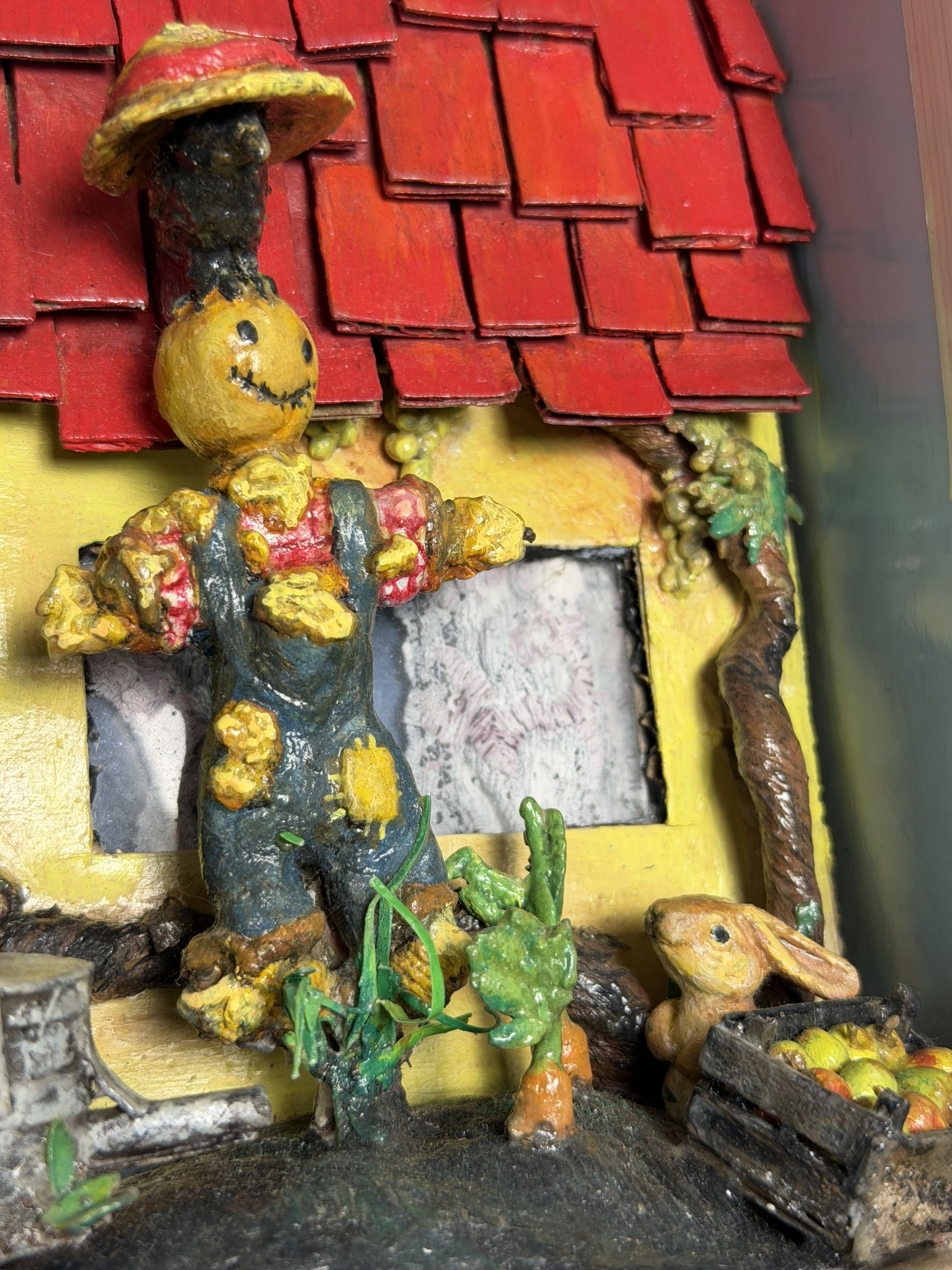 O corvo em cima do espantalho já diz que não espanta como deve ser os pássaros, nem o coelhinho a sair da terra para comer as cenouras.