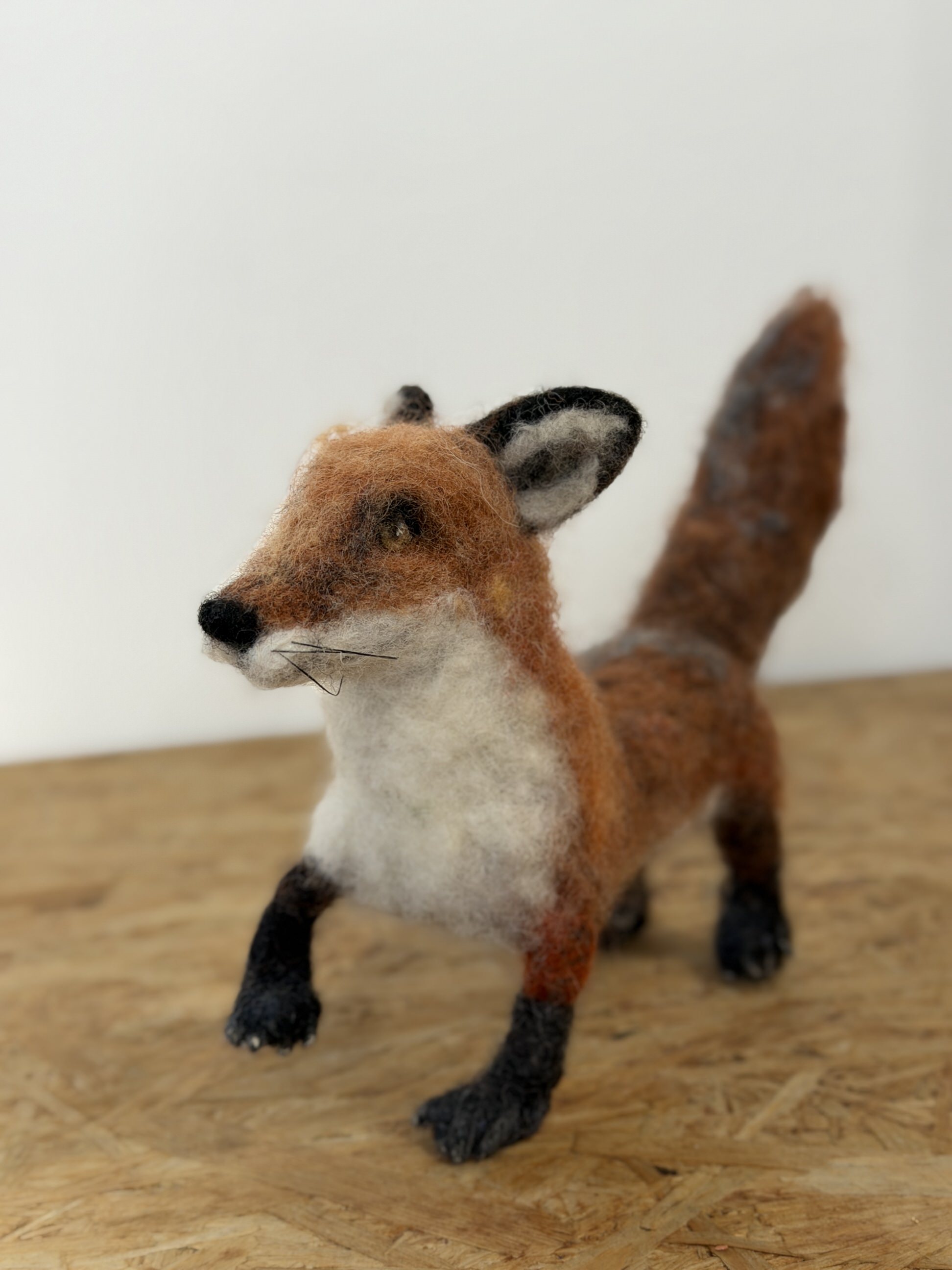 Sempre achei as raposas animais visualmente muito bonitas, a cor aver- melhada, o focinho preto, os olhos rasgados, as patinhas pretas. Tinha que recriar uma raposa em feltragem, levou dias, naturalmente foi feita com agulhas sem máquinas, só a habilidade artesanal a criar formas. Nota